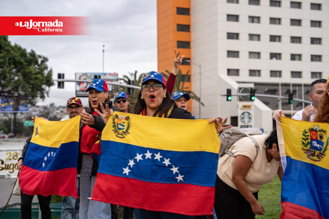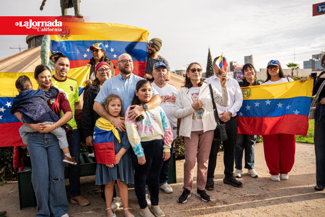 Tijuana, 3 de enero.- Integrantes de la comunidad venezolana residente en Tijuana se reunieron en la glorieta Cuauhtémoc, en la Zona Río, para manifestar su alegría tras la captura del presidente de Venezuela, Nicolás Maduro, por parte del gobierno de Estados Unidos, hecho que calificaron como histórico y uno de los momentos más importantes de sus vidas.